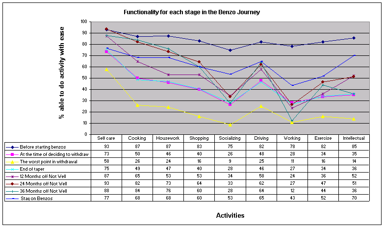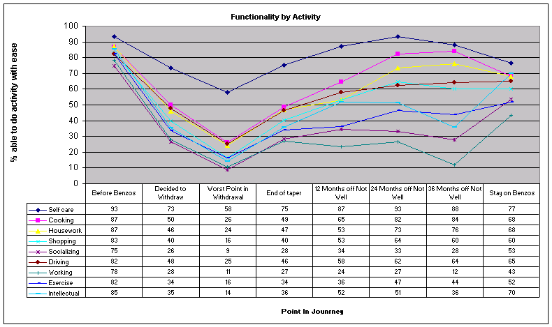 All data must be read in conjunction with the survey limitations The graph below plots a line for each of the stages in the journey off benzos and shows the percentage of respondents who were able to participate with ease in the measured activity. It shows that before starting benzos respondents rated themselves much more able to participate in all the activities than at any other of the points in the journey. Ninety three percent (93%) were able to self care without a problem and seventy five percent (75%) were able to socialize without a problem. At the worst point in withdrawal, the percentage who said that they were able to participate in the various activity was worse than at any other point in the benzo journey for all the activities. Fifty eight percent (58%) said they could self care with ease and nine percent (9%) said they were able to shop with ease.
